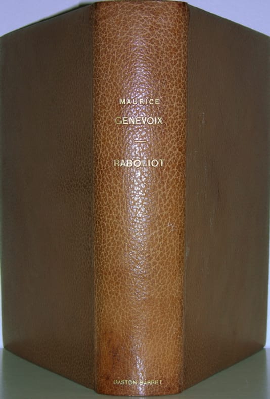 Paru dans la prestigieuse collection bibliophilique de La Belle Édition, ce Raboliot s'inscrit dans un ensemble de six titres de Maurice Genevoix sélectionnés pour leur caractère « naturaliste ». Chaque volume est confié à un illustrateur différent : Routes de l'aventure, avec des aquarelles de Pierre-Eugène Clairin ; La Boîte à pêche, avec des compositions d'André Collot ; La Dernière harde, avec des compositions et gravure à l'eau-forte en frontispice par Odette Denis ; Rémi des Rauches, avec des aquarelles de Jacques Thévenet et Rroû avec des illustrations de A. D. Steinlen, - et ce Raboliot, confié aux compositions sensibles de Paul Jarach. L'exemplaire ici présenté fut imprimé spécialement pour Sylvie Genevoix et conservé aux Vernelles, la maison familiale solognote acquise par Maurice Genevoix après le succès de Raboliot. Sylvie Genevoix y est née, y a grandi, et y a vu naître son propre rapport à la nature et à l'écriture. Elle évoquera cette maison dans une préface lumineuse à La maison de mon père : « C'est dans son havre des «Vernelles», sur un coteau dominant la Loire, que l'essentiel de l'écriture et de la vie de Maurice Genevoix s'est écoulé, à l'image du fleuve qu'il contemplait depuis son bureau. C'est dans ce nid des Vernelles que je suis née, que j'ai fait mes premiers pas, la main dans la main de mon père, là qu'il m'a appris à parler, à regarder et à m'émerveiller. [...] Je me sens, à l'égard de mon père et de cette maison à son image, redevable de tant d'indicibles trésors, de tant de ces menus riens qui enchantent ou apaisent, que je ne peux être qu'un modeste porte-parole, un témoin fidèle et attentif qui tente de transmettre et de faire partager un peu de ce qu'il a reçu. » De la bibliothèque des « Vernelles » (ex-libris).