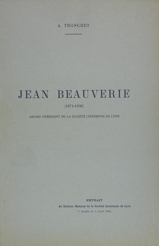 Extrait du Bulletin Mensuel de la Société Linnéenne de Lyon, 1938. Plaquette in/4 couverture imprimée, un portrait de Beauverie, 7 pages.