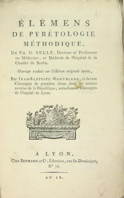 Paris Chez Reymann et Cie, Libraire. An IX 1801 in 8 (21x13,5) 1 volume broché, couverture de papier marbré de l'époque, étiquette de titre manuscrite au dos, VIII et 340 pages [2], non rogné. Christian-Gottlieb de Selle, 1748-1800, médecin de Frédéric II de Prusse. Bel exemplaire ( Photographies sur demande / We can send pictures of this book on simple request )
