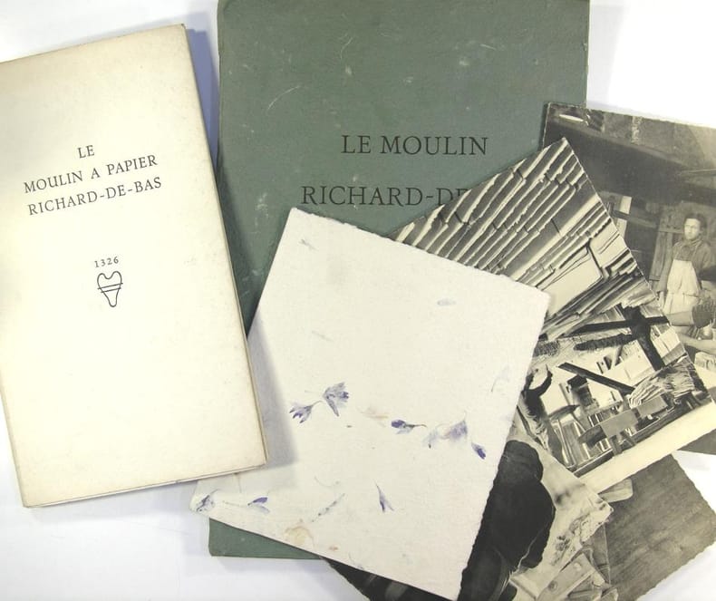 Le moulin Richard de bas : Ambert d’Auvergne, 1974. In/8 oblong, broché, couverture rempliée, frontispice, 25 pages / Le moulin Richard de bas : Ambert d’Auvergne, 1955. In/8 en feuilles sous couverture rempliée imprimée, frontispice, 26 pages. sur papier à la main. Joint : un papier à la main avec inclusion de fleurs ainsi que 4 cartes postales des années 50, excellente impression.