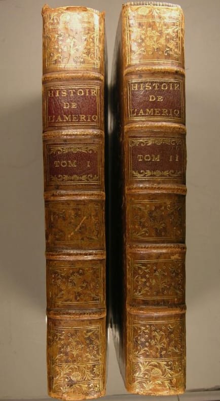 Complet des 4 plans, de la planche et de "la table chronologique des Mexicains".Cette histoire de l'Amérique est sans doute l'ouvrage le plus connu de cet historien écossais. Elle fut publiée pour la première fois entre 1777 et 1780. Au paravent son Histoire de l'Ecosse (1759) lui avait valu la reconnaissance et un poste à l'université d'Edimbourg. Il publia à la suite, en 1769, une Histoire du règne de Charles-Quint considérée comme d'une grande impartialité et précision.L'histoire de l'Amérique retrace, en huit livres, les premiers essais maritimes pour les voyages lointains, la biographie de C. Colomb, les premières conquêtes et installations espagnoles, l'état de l'Amérique au moment de sa découverte, le rôle de Cortès, la conquête du Pérou par Pizzare ; il décrit encore les possessions espagnoles du Mexique, du Pérou, du Honduras, du Chili... A la fin il dresse le tableau de la politique et du commerce des Espagnols. Il est très critique sur l'effet de leur installation sur les populations et l'exploitation des richesses. La première édition française a paru en 2 vol. in-4 en 1778 traduite par M. Suard et Jansen. Les deux derniers livres ne paraîtront qu'en 1798 dans une traduction de Morelet.
