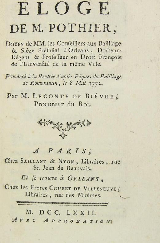 Robert-Joseph Pothier (1699-1772) jurisconsulte français. Robert-Joseph Pothier naquit à Orléans le 9 janvier 1699. Il est issu d'une famille bourgeoise orléanaise dont l'implantation et la renommée remonte au XVe siècle. En effet, sa famille compte beaucoup de magistrats locaux et un de ses ascendants fut maire d'Orléans Fermeture de la Librairie du 30/12/2025 au 11/01/2026
