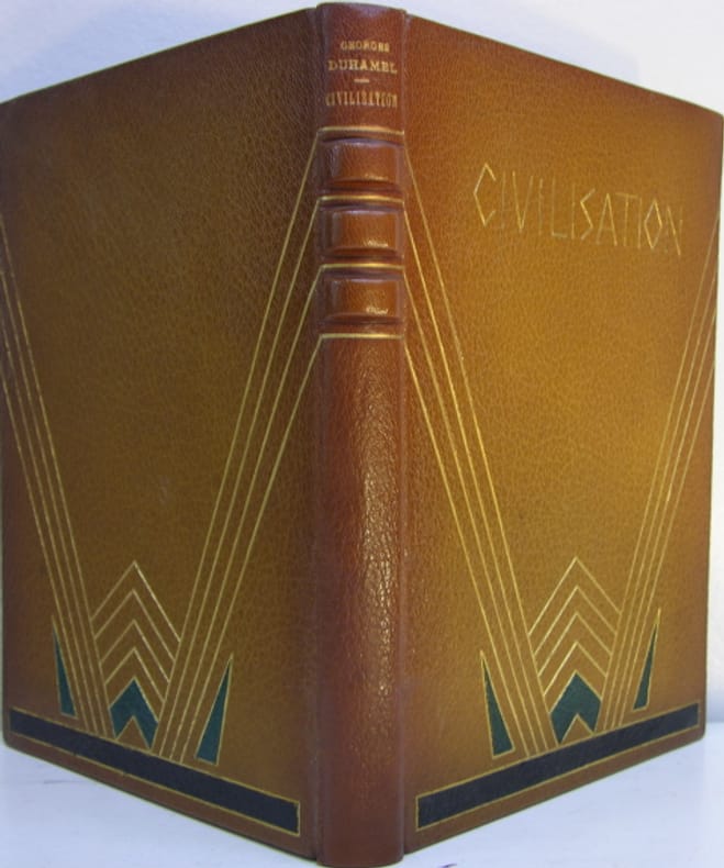 Dès la mi-décembre 1914, le médecin qu'est alors Georges Duhamel écrit à sa femme : « Je devrai à la guerre d'être sorti de mon trou habituel et d'avoir vu une collection énorme de types que rien ne pouvait me faire imaginer. » Ces premières impressions donneront lieu à son premier livre, Vie des martyrs, qui parait en avril 1917. Un titre pour lequel Genevoix exprimera son admiration, dans L'Europe nouvelle (janvier 1918). Cette expérience de chirurgien de guerre, Duhamel va l'étoffer un an plus tard pour Civilisation, sous le masque de narrateurs divers, et non combattants. Il porte un regard de compassion sur les soldats blessés et délivre un témoignage fort sur la souffrance dans les ambulances de l'arrière front. Ceci avec les réserves qu'émettra Norton-Cru dans Témoins, lequel tempère le propos enthousiaste des critiques : « Est-ce que l'auteur n'a pas joué avec trop d'insistance sur la corde de la pitié, dans un but littéraire, avec l'intention de produire des morceaux à succès ? (...) Celui qui stylise ou transpose les faits de son expérience peut prétendre faire oeuvre de littérateur, jamais de témoin. » Il n'empêche : Civilisation est couronné du prix Goncourt le 11 décembre 1918, luttant contre Koenigsmark de Pierre Benoît, Les Silences du colonel Bramble d'André Maurois et Simon le Pathétique de Jean Giraudoux. Le roman l'emporte par six voix contre quatre à Pierre Benoît, faisant définitivement renoncer Duhamel à la chirurgie pour se consacrer à l'écriture. En août 1940, Civilisation sera interdit et mis sur la liste Bernhard, avant que l'ensemble de l'oeuvre du Duhamel ne soit inscrite sur la liste Otto. À la Libération, Duhamel fera partie du Comité National des Écrivains, dont il démissionnera en 1946, désapprouvant les excès de l'épuration. L'édition originale du titre comprend les exemplaires numérotés du premier mille, auxquels s'ajoutent cinq exemplaires de tête sur chine - hors commerce - et trente-sept sur hollande. Bel exemplaire du premier tirage avec ses fragiles couvertures à l'état de neuf.
