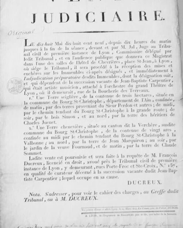 Affichette de 42 x 30 cm - imprimerie Ballanche, Lyon, 1809. Un tampon en marge gauche du document et une mention manuscrite en bordure inférieure et "original" écrit sous le titre. Bon état.