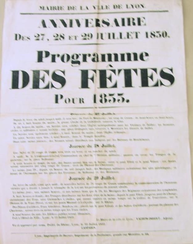 Fêtes organisées pour commémorer l'issue de la révolte de 1830 : canon, services religieux, revue des troupes, joutes sur la saône, feux d'artifices...