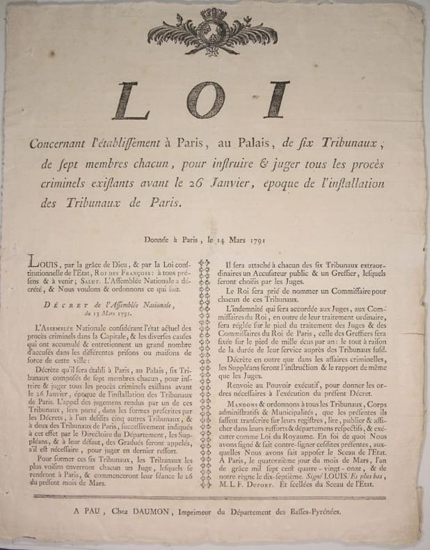 Affiche en très bon état. Suite a l'installation sur Paris au palais de six tribunaux composés de sept membres....