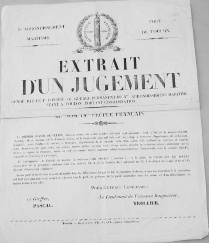 Condamnation à une peine de trois ans de boulet (travaux forcés) pour Antoine Soubie déserteur à l'étranger.