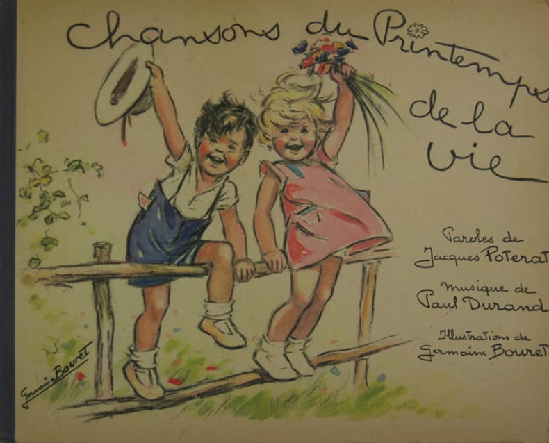 Paroles de Jacques Poterat, musique de Paul Durand, Illustrations de Germaine Bouret, 1 vol. petit in-4 oblong, cartonnage éditeur illustré, Aux Editions Arc-en-Ciel, Paris, 1945
