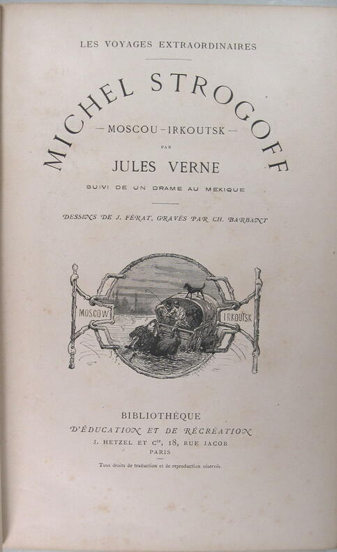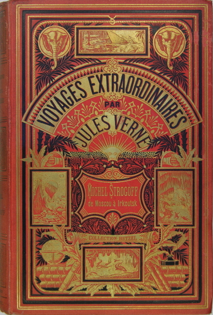 Editions Librairie Hachette / Collection Hetzel / Les Voyages Extraordinaires 1924. In-4 reliure éditeur pleine toile rouge de 340 pages au format 18,5 x 4 x 28 cm. Premier plat à l'éléphant avec " Voyages Extraordinaires par Jules Verne " inscrit dans l'éventail. Titre doré entouré de deux illustrations dorées ( Ballon et Ours ), insérées dans un cadre bordé de noir. Belles décorations aux fers dorés. Elégantes fleurs en noir. Dos au phare, avec petits tassements en haut et en bas. Tête dorée. A noter l'extrème fraicheur des dorures, ce qui est très rare pour les volumes publiés à cette date. Minuscules frottis et tassements aux coins. Intérieur frais, proche du parfait, à l'exception d'une petite déchirure au bord extérieur des pages 295/296. Volume simple qui contient " Michel Strogoff, Moscou - Irkoutsk " avec des illustrations en noir par Jean Férat, gravées par Charles Barbant, dont 2 cartes. Réédition. Rare exemplaire dans un tel état de fraicheur. Peu courant aussi frais.