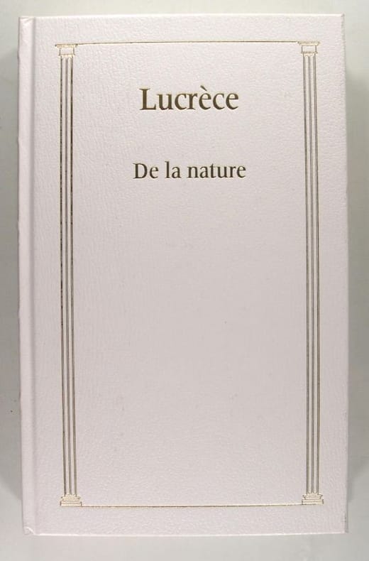 Lucrèce : poète philosophe latin du Ier siècle av. J.-C., auteur d'un seul livre inachevé, le De rerum natura (De la nature des choses, qu’on traduit le plus souvent par De la nature), un long poème passionné qui décrit le monde selon les principes d'Épicure. C’est essentiellement grâce à lui que nous connaissons l'une des plus importantes écoles philosophiques de l'Antiquité, l'épicurisme, car des ouvrages d’Épicure, qui fut beaucoup lu et célébré dans toute l’Antiquité tardive, il ne reste pratiquement rien, sauf trois lettres et quelques sentences.
