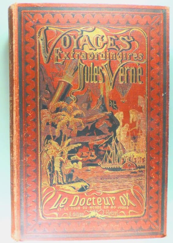 2 ouvrages en 1 volume. Les Voyages Extraordinaires. 6 hors texte en couleurs et 1 carte.1° Le Tour du monde en quatre-vingts jours. Dessins par MM. De Neuville et L. Benett. 217 pages et une carte double page.Le Docteur Ox - Maitre Zacharius - Un Hivernage dans les glaces - Un Drame dans les airs. Dessins par Bertrand, Froelich, Th. Schuler, Bayard et Marie. 211 pages. Pas de catalogue.Paris, Collection Hetzel - non daté (1905 à 1910) - 217 et 211 pages . Imprimé par Belin Frères. Relié par Engel.Cartonnage Hetzel polychrome à 1 éléphant <b>- </b>titre dans l'éventail. Dos au phare. Une décoloration en bas du dos. Tranches dorées. Gouttière régulière. 1 cahier décalé. Pas de rousseur. Très bon état. Format in-4°(28x18).