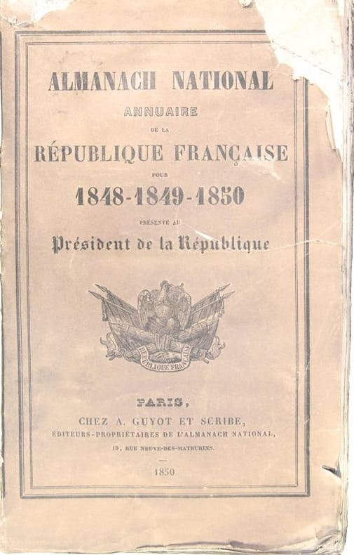 L'Almanach royal fut débaptisé et titra donc "Almanach National" pour cet intervalle républicain. Contient la Constitution, les différents acteurs de la vie politique et administrative, ordres de la Légion d'honneur depuis 1815), les cultes, tribunaux, le génie, l'armée, ... pour le territoire français et les colonies, les préfectures, officiers publics et ministériels, postes, poids et mesures.