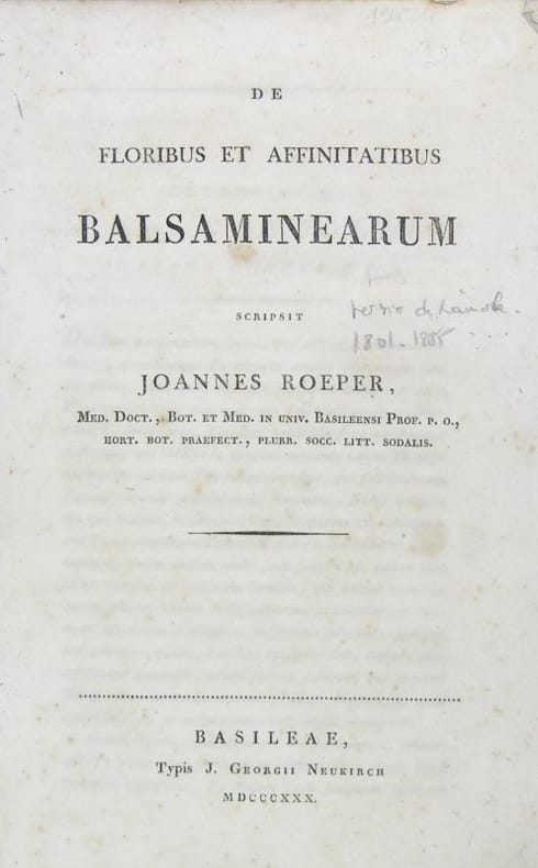 Bâle, J.G. Neukirch, 1830, in-8, II-70 pp, 1 pl, Demi-basane cerise de l'époque, dos orné de filets doré et à froid, pièce de titre fauve, Première et unique édition de cette monographie par le médecin et botaniste Johannes August Christian Ro?per (1801-1885). Exemplaire bien complet de la planche "Positio relativa florum in impatiente, balsamina hydroceraque", qui manque souvent. L'auteur avait fait l'acquisition en 1824 de l'herbier de Lamarck, sur les conseils d'Alexander von Humboldt Cachets de l'Institut catholique de Paris et étiquette en pied du dos. Dos usé, manque à la coiffe supérieure. Rousseurs. Couverture rigide