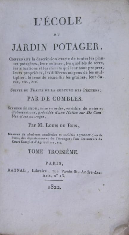 Paris, Raynal, 1822. In-12 (18 x 11 cm) en brochage d'attente, tranches non massicotées, 1 f., 141 p., 1 f., cinquième édition revue et corrigée - l'école du jardin potager, sixième édition par Louid du Bois, tome 3, 119 pages + 12 pages de table des matiére. Manquent l'épitre dédicatoire, la préface et la notice de Louis du Bois sur de Comble et ses ouvrages (13 f.)