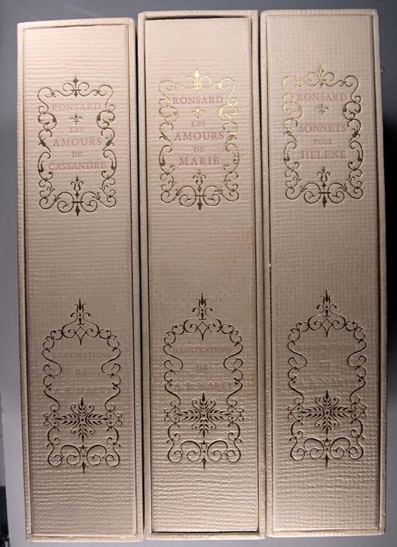 Les Heures Claires Feuilles sous couverture et emboîtage 1957 "Trois volumes in-8 (20 x 25 cm), exemplaires en feuilles sous couverture rempliée et emboîtage, 174 pages chacun, trois oeuvres de Ronsard illustrées par Marty : ""Sonnets pour Hélène"" // ""Les Amours de Cassandre"" // Les Amours de Marie"", 1 des 1650 exemplaires sur vélin pur fil de Rives ; zones brunies et traces dont quelques mouillures sur les emboîtages, une arête fendue à l'étui des ""Sonnets pour Hélène"", plats un peu roussis, par ailleurs intérieur frais, assez bel état. Livraison a domicile (La Poste) ou en Mondial Relay sur simple demande."