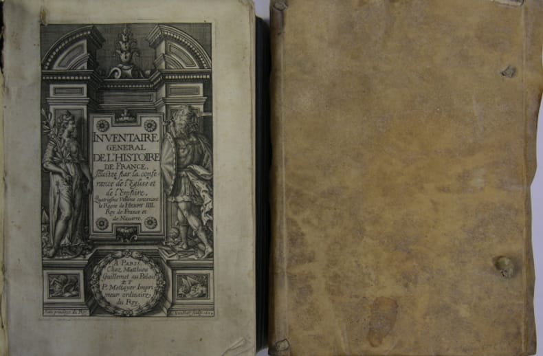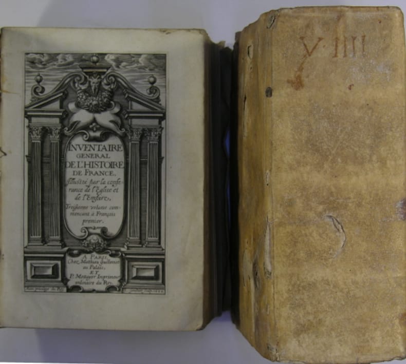 A Paris, chez Matthieu Guillemot & Mettayer imprimeur, 1608. 2 volumes fort in/8 en reliure plein velin du temps, dos lisses aveugles, pages de titre gravées (L. Gaultier) ; tome 3 : "François premier" 2 f., 902 p., 18 f. de table - tome 4 : "Henri IIII" 2 f., 1131 p., 23 f. de table. Menus défauts en tome 4 (manques en plat inférieur et petit enfoncement sur le dos) ; auréole claire sur les feuillets de la table ; des erreurs et saut de pagination sans manque de texte ; dans l'ensemble un bon exemplaire.