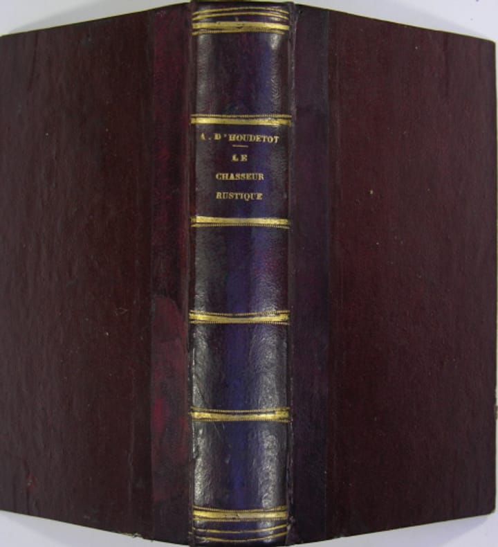 Edition originale ; s'ouvrant sur un frontispice gravé sur bois par Horace Vernet. " Possesseur d'un fusil à douze ans, soldat à seize, sans un pouce de terre, mais braconnant officiellement alors que le garde champêtre s'attendrissait devant une pièce de 50 centimes ", Adolphe d'Houdetot faisait dans sa jeunesse l'ouverture de la chasse dans la plaine Saint-Denis ! Son Chasseur Rustique, publié pour la première fois en 1847, fait revivre ce paradis perdu et connut dès sa parution un succès qui s'explique aisément : c'est là l'expérience de toute une vie de chasseur passionné qui s'y trouve consignée. Ce qu'il dit du dressage des chiens d'arrêt, du tir du perdreau, de la quête du lièvre ou du vol de la bécasse n'a rien perdu de son intérêt ni de sa justesse. Mais le chasseur d'aujourd'hui goûtera d'autant plus ces pages joyeuses qu'elles sont constamment éclairées d'ironiques anecdotes mettant à nu l'âme de " l'homo cygeneticus ".Ainsi reconnaîtra-t-il peut-être, au détour d'une histoire burlesque ou gentiment paillarde, à l'évocation de l'omelette au sang de chevreuil ou de la grillade de sanglier au cidre, son propre portrait...'' Thiébaud, Bibliographie des ouvrages français sur la chasse, 504 - Souhart, Bibliographie générale des ouvrages sur la chasse, 251. Angles légèrement élimés. Discrète décoloration affectant chacun des plats. Présence de rousseurs et quelques tâches dans le corps d'ouvrage ; sans toutefois entraver la lecture. Du reste, bonne condition.