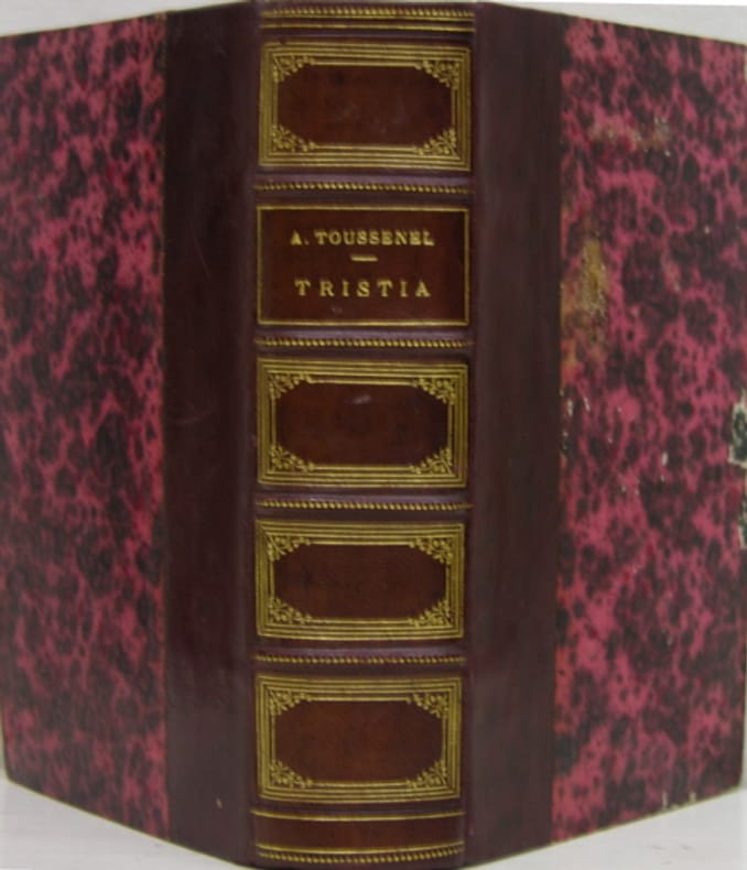 Édition originale. L'ouvrage, l'un des moins connus du socialiste Alphonse Toussenel (1803-1885), montre que le souci de la protection des oiseaux ne date pas de nos jours. Parmi les espèces menacées, figurent déjà la bécassine, la gélinotte, la grive, l'alouette, etc.Thiébaud 905.Exemplaire dans lequel a été inséré avant l'errata un feuillet manuscrit portant la notice : "Mr. le docteur Pigeaux, un des secrétaires de la Société protectrice des animaux, a rendu compte du volume Tristia de Mr. Toussenel ; voir ce curieux et spirituel compte-rendu dans le Bulletin de la Société protectrice, mois d'octobre 1863". - - VENTE PAR CORRESPONDANCE UNIQUEMENT