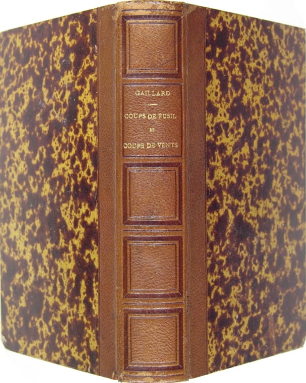 Manque à la coiffe supérieure. Faisait partie de la collection d'ouvrages de chasse du Commandant Garnier, auteur entre autre de "176 Anecdotes cynégétiques" & "Traité complet de la chasse des alouettes". Thiebaud col. 440.
