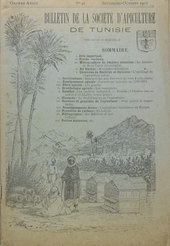 Société d'apiculture de Tunisie, 1911-1912. 2 numéros brochés (24 x 15 cm), illustrations (dessins et photographies), 8 feuillets de texte, 8 feuillets de publicités illustrés par numéro.