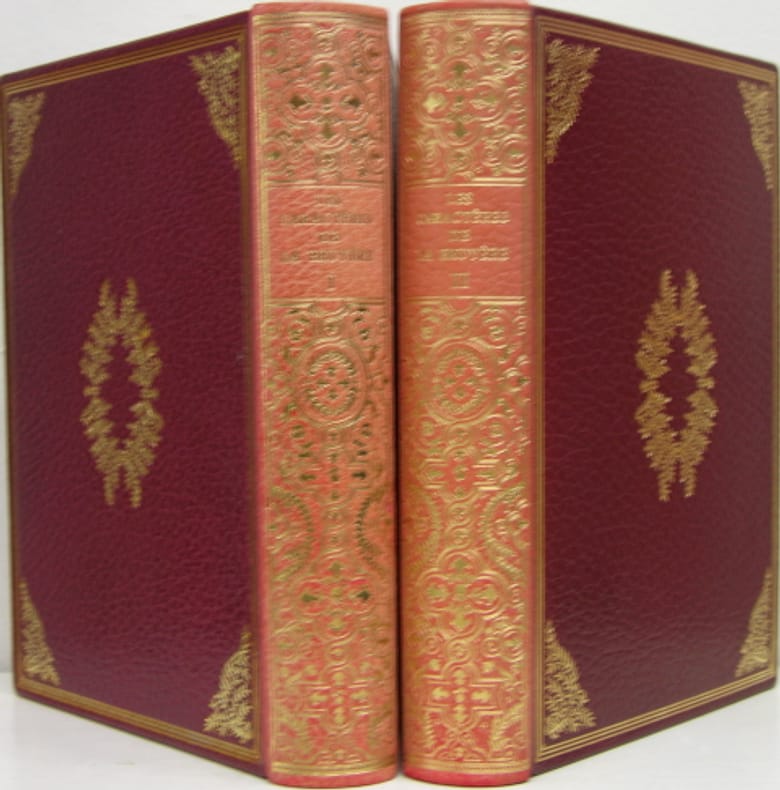 avec des notes par M. Coste, Nouvelle édition, complet de ses deux frontispices gravés. Clefs des caractères, Discours de Théophraste, Caractères de La Bruyère, Discours prononcé dans l'Académie françoise, avec préface, Défense de La Bruyère et de ses caractères, contre les accusations et les objections de Vigneul-Marville par Coste. vols in-8, 170x100, reliés pleine basane époque, fendillement du mors sur qq cm, traces de mouillures sèches, solides, bien frais, beaux exemplaires, 422, 374pp. Paris, Chez Michel Etienne David, 1775 Les "Caractères" de Théophraste et "Les Caractères ou les Mœurs de ce siècle" de Jean de La Bruyère sont deux œuvres littéraires qui se concentrent sur la description des différents traits de caractère et des défauts humains. Bien qu'ils partagent un thème similaire, ils ont été écrits à différentes époques et présentent des différences dans leur approche et leur style. Les "Caractères" de Théophraste sont un recueil de courts portraits et descriptions de caractères humains, écrits par Théophraste, un philosophe grec du 4ème siècle avant notre ère et disciple d'Aristote. Les portraits de Théophraste décrivent des types de personnes, tels que l'avare, le flatteur, l'hypocrite, l'envieux, etc. Chaque portrait met en évidence les traits spécifiques de chaque personnage et propose une observation satirique de la nature humaine. D'autre part, "Les Caractères ou les Mœurs de ce siècle" de Jean de La Bruyère ont été publiés en 1688. Ce livre offre des descriptions des différents types de personnes de la société française du 17ème siècle. Les caractères décrits par La Bruyère sont souvent basés sur des observations et des critiques sociales. Ils mettent en lumière les comportements, les vices et les travers des individus de l'époque, tels que les flatteurs, les hypocrites, les courtisans, les vaniteux, etc. Dans les deux œuvres, Théophraste et La Bruyère utilisent la satire pour souligner les défauts et les absurdités des comportements humains. Ils observent les comportements sociaux et dépeignent les caractères avec finesse et précision, offrant des commentaires acérés sur la nature humaine. ref/25/2