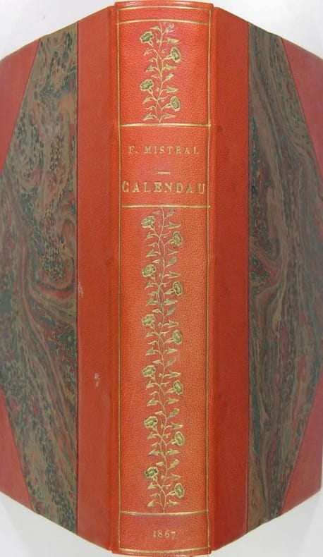 Avignon, J. Roumanille libraire éditeur, 1867. Grand in/8 reliure demi-chagrin à coins rouge, dos lisse à décor doré, doré sur tête, frontispice : portrait par Hébert, couvertures conservées, 537 pages. Edition originale.
