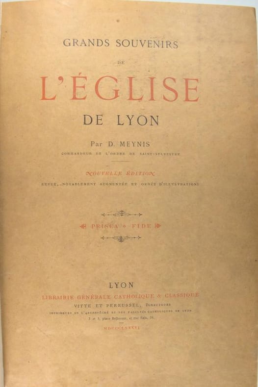 Dominique MEYNIS (1800-1887) naît en 1800 dans le Forez, il est frère tertiaire de Marie et occupe plusieurs fonctions au sein du diocèse : président du conseil de fabrique de la paroisse Saint Irénée, président du Comité des Ecoles de Saint-Irénée et Saint-Just, secrétaire de la Confrérie des martyrs de Lyon, en 1834, membre du Conseil central de l’Œuvre de la Propagation de la Foi dont il devient secrétaire, en 1850, membre de la commission de Fourvière, membre de la Confrérie Notre-Dame de Fourvière. Dominique MEYNIS représente bien ces diocésains qui veulent « reconstruire » la vie religieuse au XIXème siècle, avec des œuvres grandioses (Basilique de Fourvière, Écoles catholiques, Œuvre de Propagation de la Foi…), l’asseyant sur la tradition (travaux de recherche sur les martyrs de Lyon, les hommes illustres du diocèse, le culte marial, etc.), avec souvent un accent d’apologétique ou de revanche. L’avant-propos de son ouvrage Les Grands souvenirs de l’Église de Lyon en montre le dessein. Fort volume in-8, 22x13, relié demi cuir, 542pp, qq rousseurs, bon exemplaire peu courant Lyon, chez tous les Libraires, 1867 ref/13