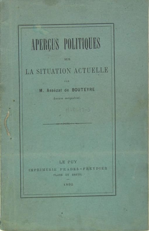 Le Puy, imprimerie Prades Freydier, 1892. Plaquette in-2 (19 x 12 cm) cahier cousu, couverture imprimée, 35 pages. Avec un envoi de l'auteur (ancien magistrat) pour Charles Calemard de La Fayette (1815-1901) en page de titre.