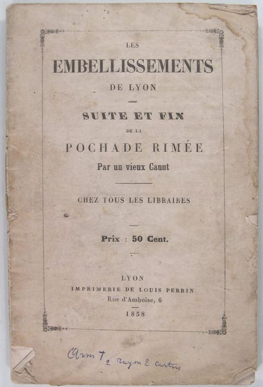 Joint : un article de journal découpé "Feuilleton du Salut Public du 1er janvier" (sans date) : Les embellissements de Lyon pochade rimée, par un vieux Canut. Fermeture de la Librairie du 30/12/2025 au 11/01/2026