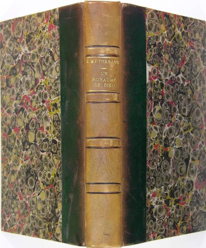 avec 12 gravures imprimées en couleurs d'après les aquarelles de Manuel Orazi, exemplaire sur velin, n°1991. Roman écrit par les frères Jérôme et Jean Tharaud, deux écrivains français du début du 20e siècle. Le livre a été publié en 1911 et est l'un de leurs ouvrages les plus célèbres. Le roman "Un royaume de Dieu" est une exploration de la vie monastique et religieuse dans un couvent français au début du 20e siècle. Il raconte l'histoire de la vie quotidienne des moines et des sœurs dans un monastère bénédictin, en mettant l'accent sur leur foi, leurs doutes, leurs sacrifices et leurs interactions au sein de la communauté religieuse. Le livre examine également les tensions entre la foi religieuse profonde et la modernité croissante qui sévissait à l'époque. Il offre un regard sur les luttes intérieures des personnages face aux questions de la foi, de la vocation et de la vie spirituelle. "Un royaume de Dieu" est souvent considéré comme une œuvre importante de la littérature religieuse et spirituelle française de son époque. Il est également salué pour sa représentation réaliste de la vie monastique et de la spiritualité, ainsi que pour sa réflexion sur les enjeux religieux et sociaux de l'époque. vol relié, demi cuir à coins, superbe reliure, tranche de tête dorée, couvertures d'origines conservées, 190x125, parfait état intérieur, 207pp Paris, Plon 1933
