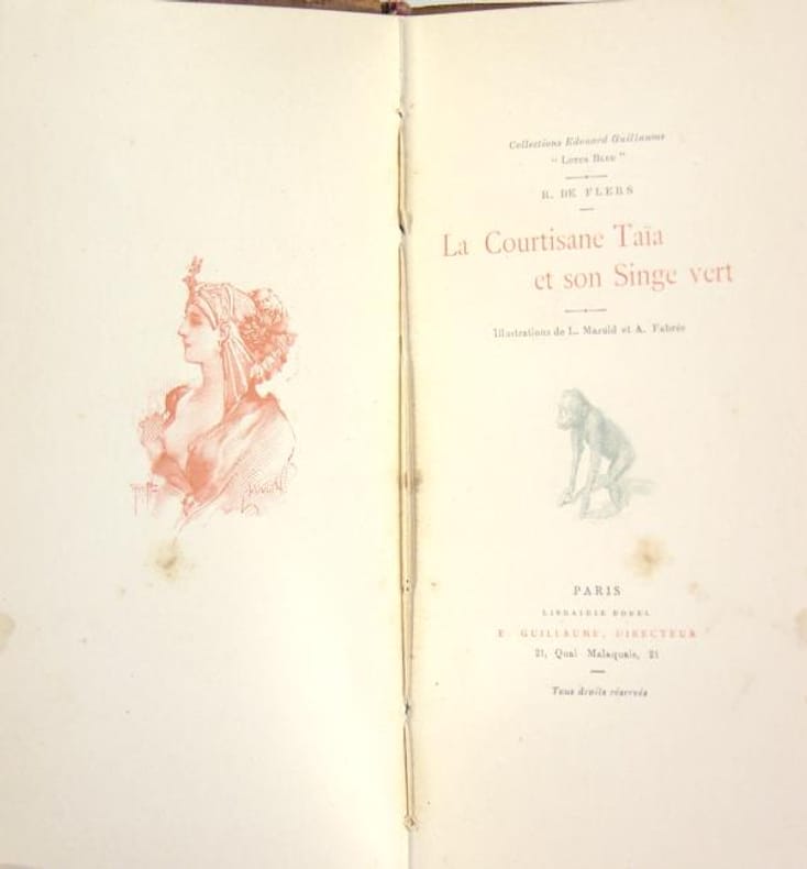 illustrations de L. Marold et A. Fabré Taïa partit où vont les courtisanes, partout, n’importe où. Pour ne point s’attirer le mépris du monde, elle voulut être la prêtresse d’Hathôr, déesse du Plaisir et de la Toilette, sentant pour elle une sincère dévotion appelée à grandir... Aussi Taïa fut-elle bientôt la plus riche courtisane de tout l’empire. ... Charmant ouvrage joliment illustré, 14x17, relié demi cuir, fendillement du mors, solide, bon exemplaire. 115pp. Couvertures d'origines conservées. Paris, Collection Guillaume, 1896 ref/262