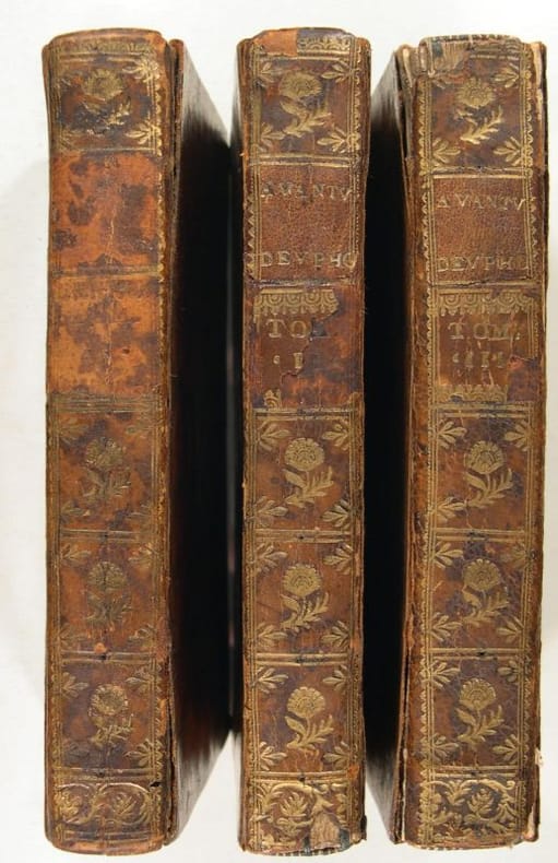 A Anvers, chez de Plantin, 1711. 3 volumes in-12 (16 x 9 cm) reliures plein veau tacheté du temps, dos lisses à caissons dorés, tranches rouges, vol. 1 : 10 f., 233 p. ; vol. 2 : 252 p. ; vol. 3 : 308 p., 2 f. d'errata. 1 feuillet manuscrit sur chaque volume en début ou en fin d'ouvrage (notes bibliographiques sur l'oeuvre originale de Barclay). Manque les pièces de titre du vol. 1 et partiellement sur le vol.2, 3 coiffes abîmées ; feuillets propres.