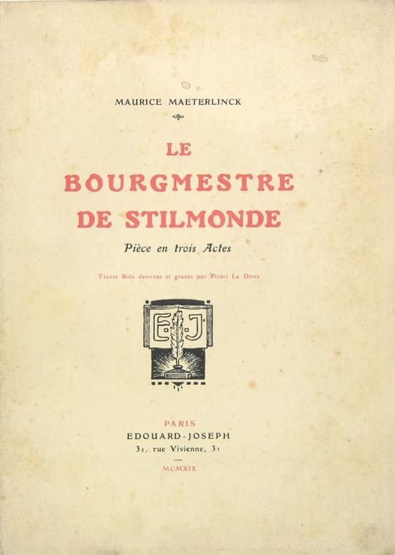 Édition originale, un des 1195 exemplaires numérotés sur vélin Lafuma de Voiron. ""Cette pièce dramatique relatant le martyre et l'invasion de la Belgique"" écrit en 1917, a été créé à Buenos-Aires en 1918 dans une version espagnole. Au moment de cette publication, ainsi que Meaterlinck nous avertit, la censure en interdit encore la représentation en France. Très bon état