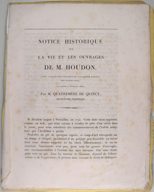 Lue à la séance publique de l'Académie Royale, des Beaux Arts le 2 octobre 1841. Jean-Antoine Houdon : Né à Versailles en 1741, entre très jeune à l’Ecole royale des élèves protégés, où il s’adonne à la sculpture. En 1761, il remporte le concours du Prix de Rome, ville dans laquelle il séjournera de 1764 à 1768. Il y réalise, en 1767, son célèbre Ecorché, qui témoigne de son vif intérêt pour l’anatomie du corps humain, autant que de sa volonté de reproduire fidèlement la nature.
