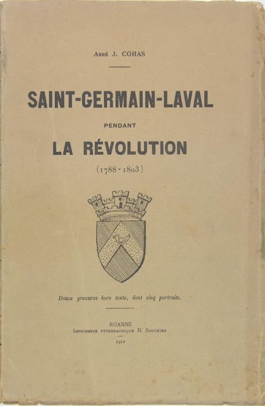 Roanne, Imprimerie Typographique M.Souchier, 1912 - Fort et grand in-Octavo broché, couverture souple sobrement titrée en noir estampée de l'écusson de Saint Germain Laval, tranche de même rappel, VIII (liste des souscripteurs) -X ( introduction), et 536 pp, Iconographie hors pagination sur douze feuillets en noir, 5 clichés par P.Bouillet et M.Roi. sous serpente. Couverture malmenée présentant quelques manques et accrocs, quelques défauts sans gravité en tout début de pagination n'affectant pas la pagination et l'ensemble du texte dont le papier à pontuseaux n'est pas épidermé et d'agréable fraîcheur, bonne tenue par ailleurs de cet ensemble qui pourrait être relié sans difficulté (grandes marges et non rogné).