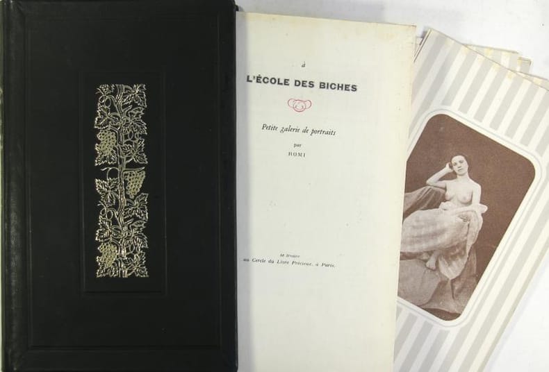 Paris, Cercle du livre précieux, collection Le cabinet rose et noir, 1960. In-8 oblong (20 x 13 cm) reliure éditeur en pleine basane noire à décor doré sur le dos et le plat supérieur, 219 p. Exemplaire numéroté (n°750). Comporte également un texte de ROMI "Petite galerie de portraits" ainsi que 11 photographies en feuille in-fine.