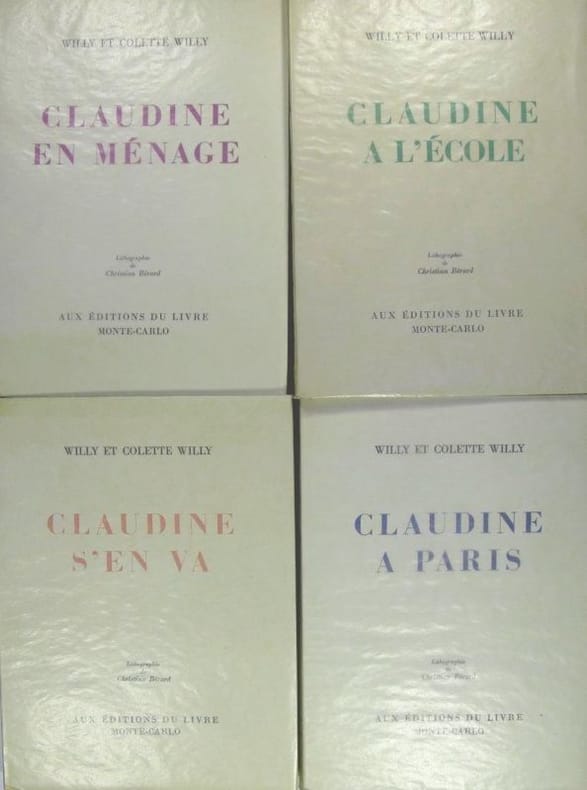 ÉDITIONS ORIGINALES sur papier dédition des "Claudine" écrite par Colette mais signée par son mari Willy. En 1893, la jeune Colette épouse lécrivain et critique musical Henri Gauthier-Villars, dit « Willy » . Il est connu pour avoir pas mal de nègres, et lorsquil découvre les talents littéraires de sa femme, il lui demande décrire ses souvenirs dadolescence qui deviendront bientôt les Claudine. Colette en parle ainsi: « Il y a des années que jai pris un tas de notes en journal, et je naurais jamais osé croire que ce fût lisible. Mais, grâce à Belle-Doucette (Willy), qui a élagué et atténué des crudités par trop claudinières, Claudine est devenue acceptable. » Et pourtant, les romans sont un véritable succès lors de leur parution mais Colette ne tire aucun profit financier de cette série qui lance sa carrière littéraire car Willy a vendu les droits à ses éditeurs, sans même prévenir Colette. Elle finit par saffranchir de cette tutelle, e; 1903 elle écrit Claudine sen va (1903) et s'en va avec son héroïne, elle divorce de Willy, Superbe exemplaire de la collection des "Claudine".