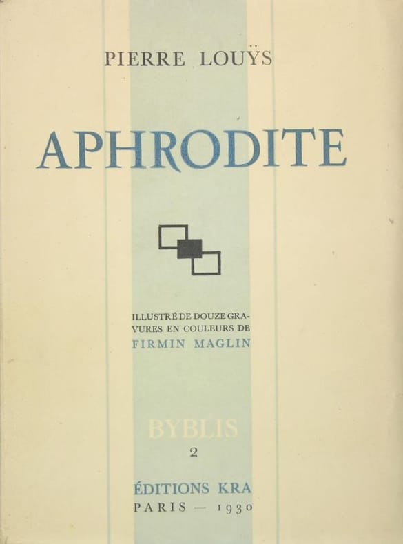 Aphrodite est le premier roman de Pierre Louÿs : il conte les amours tourmentées, torturées et impossibles entre la courtisane Chrysis et le sculpteur Démétrios, C'est d'abord un petit texte qui parut en 1893, sous le titre de Chrysis ou la cérémonie matinale : cette édition originale, du premier chapitre seul, n'a été tirée à 125 exemplaires, à la Librairie de l'Art indépendant. Alfred Valette, le directeur du Mercure de France, conforté par le succès des Chansons de Bilitis, accepta de publier deux ans plus tard le texte définitif, d'abord en feuilletons au sein du Mercure de France (sous le titre L'Esclavage, entre août 1895 et janvier 1896), puis dans une édition in-12. C'est un article élogieux, voire dithyrambique, de François Coppée, publié dans Le Journal du 15 avril 1896 qui met l'oeuvre en lumière : portée par sa réputation sulfureuse, Aphrodite connaît alors un succès éditorial croissant, poussant Valette à procéder à une nouvelle édition en fin d'année, cette fois in-8 - et avec des grands papiers (9 japon et 20 hollande).