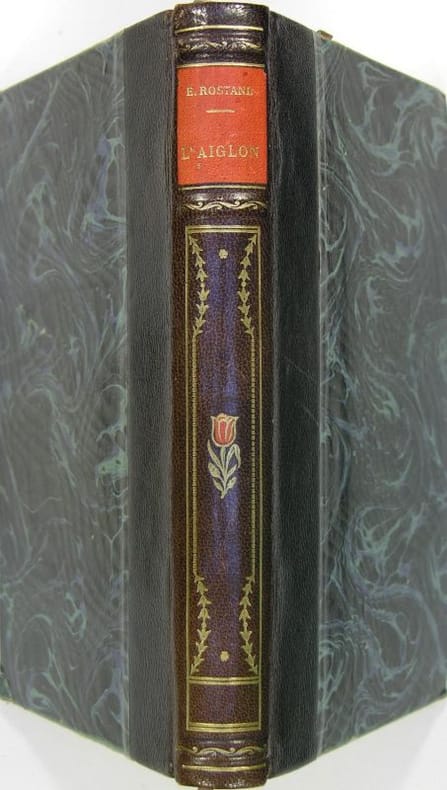 L’Aiglon est un drame en vers d'Edmond Rostand écrit en 1900. Il narre, de façon romancée, les dernières années et la mort du duc de Reichstadt, fils de Napoléon Iᵉʳ. La pièce, qui fait intervenir 52 acteurs, fut représentée pour la première fois le 15 mars 1900 au théâtre Sarah-Bernhardt. Vienne, Schönbrunn, Metternich, un empire qui se croyait éternel malgré l'ombre de Napoléon qui pèse encore sur l'Europe à travers un jeune homme irrésistible de charme, de fragilité et de mélancolie, une sorte d'Hamlet androgyne qui fut le grand rôle de Sarah Bernhardt et qui était le duc de Reichstadt, le fils de l'Ogre et de l'Aigle : le roi de Rome, l'Aiglon. Les ailes de l'Aiglon naissent, s'ouvrent, palpitent au souvenir de tant de puissance et de gloire, tels que les évoque devant lui Séraphin Flambeau, le grognard légendaire de la Grande Armée. Mais l'histoire n'aime pas les redites et les ailes meurtries vont bientôt se fermer. Le roi de Rome mourra comme il a vécu, en prince autrichien, la pièce se terminant sur la réplique fameuse de Metternich (qui a eu tout de même un peu peur) : " Vous lui remettrez son uniforme blanc." vol.in8, relié demi cuir, 200x150, bel exemplaire, 262pp. Paris. Charpentier & Fasquelle 1904 ref/c91