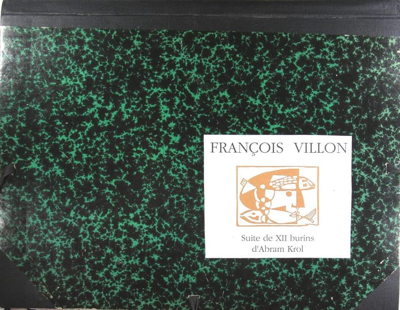Chez l'artiste, 1995. In folio oblong en feuilles sous couverture et carton à dessin portant une vignette contrecollée, 1 feuillet de textes, une suite de 12 burins, joint : une gravure sur chine contrecollée sur un japon nacré. Exemplaire nominatif signé de l'artiste. Tirage limité à seulement 24 exemplaires.Fo unbound sheets under a drawing folder, a sheet of text, a suite of 12 copperplates ; enclosed a plate on rice paper stuck on japanese vellum signed by the artist. Limited edition : only 24 copies. This one named copy signed by A. Krol.
