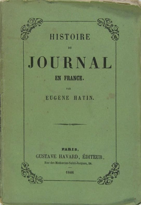 Hatin, Eugène (1809-1893) écrivit en 1859 un ouvrage bien plus conséquent sur le sujet : "Histoire politique et littéraire de la presse en France". Ce travail a été considéré comme n’ayant guère d’équivalent à l’étranger. Hatin a, en outre, collaboré au Dictionnaire des Dates, à l’Histoire des villes de France, au Complément de l’Encyclopédie du XIXe siècle, etc., et fondé le premier journal politique à cinq centimes la Seine et, en 1854, le périodique l’Union littéraire devenu Bulletin des sociétés savantes.