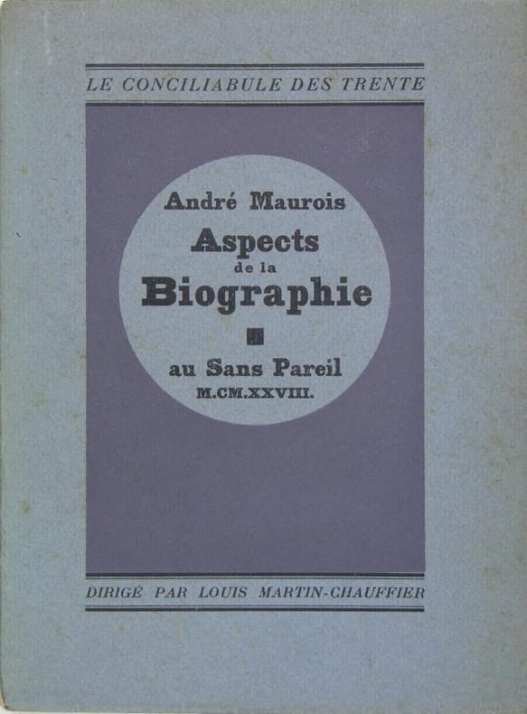 1928 1928 Paris, Au Sans Pareil 1928 1 Bon état de conservation , exemplaire agréable; coiffe abimée . Reliure Demi-Chagrin Bordeaux dos à nerfs 178[pp] Le biographe moderne, s'il est honnête, s'interdit de penser : "Voici un grand roi, un grand ministre, un grand écrivain ; autour de son nom a été construite une légende; c'est cette légende, et elle seule, que je souhaite exposer." Non. Il pense : "Voici un homme. Je possède sur lui un certain nombre de documents et de témoignages. Je vais essayer de dessiner un portrait vrai. Que sera ce portrait ? Je n'en sais rien. Je ne veux pas le savoir avant de l'avoir achevé." [Aspect de la biographie. p. 128 ]