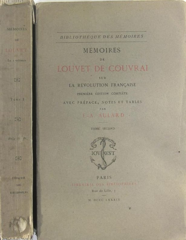 Paris, Librairie des Bibliophiles, Bibliothèque des Mémoires, Jouaust, 1889, 2 volumes, in-12 brochés, XXVIII + 256 + 288 pp. Non coupés. 1Ere édition complète des Mémoires de Louvet de Couvrai, préfacée et annotée par Alphonse Aulard. . Un des 300 exemplaires numérotés sur Hollande. T2 en partie non coupé. Couvertures en bon état, intérieurs en très bon état avec défraichissement des gardes.