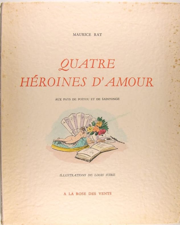 Maurice Rat, Louis Suire, Quatre héroine d’amour, A La Rose des Vents 1957, broché, couverture rempliée, 4ème de couverture très légèrement insolée le long du dos, ex. n° 82 ( 1 des 150 sur Arches ), illustrations coul. par Louis Suire, 117 pages, bel exemplaire.