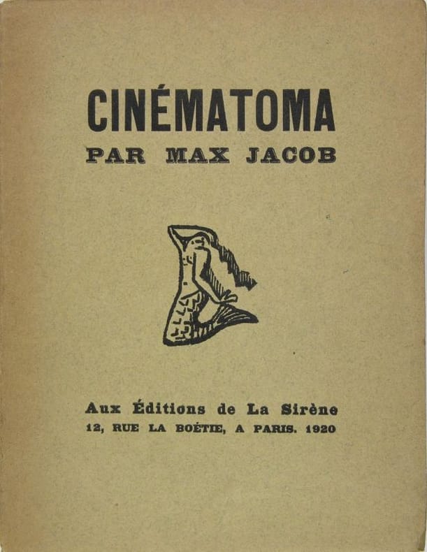 Paris Aux éditions de la Sirène 1920 302 pp. In-12 Relié. Très bel état. 1 volume. EDITION ORIGINALE. Un des 45 exemplaires de tête numérotés sur papier de Corée. Depuis ses débuts, le cinéma fascine Max Jacob. Il se rend régulièrement dans les salles obscures. IL connaît par coeur les classiques de son temps, et défend les films sans voix. Cinématoma est le deuxième et dernier ouvrage publié à La Sirène. En effet, Jacob a promis son manuscrit pour la fin de 1918, et a du mal à respecter ses délais. De plus, il ne s'entend pas les éditeurs de La Sirène fondée par Jean Cocteau, Blaise Cendrars et Jacques Lafitte. Ce livre est composé d'une quinzaine de portraits d'hommes et de femmes ordinaires, provinciaux et parisiens: "Celle sui a trouvé un mari", "L'avocat qui aura deux femmes au lieu d'une", "Le Monsieur qui se mêle de ce qui ne le regardepas", etc.