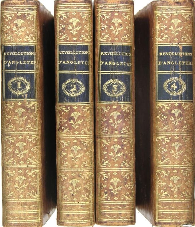 Jean-François Bastien 13 x 21 Paris 1796 Quatre volumes in-8, an quatrième [1796], reliure demi-basane verte du XIXe siècle, dos lisse, filets, titres et tomaisons dorés, plats cartonnés marbrés de vert, tranches jaunes, VI-530, [4]496, [4]-483, [4]-466 pp., une carte d'Angleterre dépliante en tissus précédant la page de titre du tome 1 (carte anglaise "Etchin's most accurate Map of the roads of England & Wales, printed for Andrew Dury..), une gravure contrecollée en guise de frontispice du tome 3. "L'Histoire des Révolutions d'Angleterre" du Père Jésuite d'Orléans (1641-1698), publiée pour la première fois en 1689, a été rééditées au XVIIIe siècle et au moment de la Révolution française. Reliure correcte, coins un peu émoussés, soulignement au crayon de papier à certains passages, écriture au crayon de papier sur la page de faux titre du tome second, petit accroc au plats supérieur du tome 4, intérieur correct, carte en tissus en très mauvais état.(EvC135) PHOTOS NUMERIQUES DISPONIBLES PAR EMAIL SUR SIMPLE DEMANDE-DIGITAL PHOTOGRAPS MAY BE AVAILABLE ON REQUEST Livre