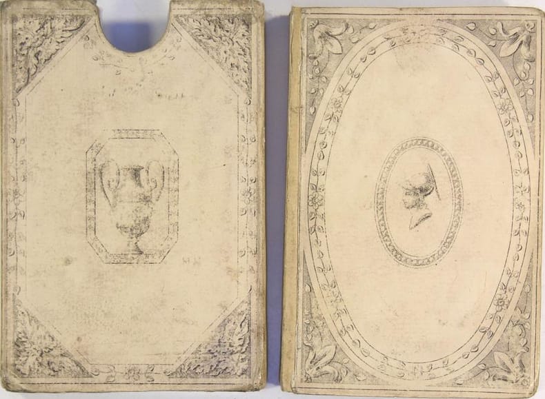 A Paris chez Le Fuel sd (1820). In-18 76 feuillets non chiffrés 11 feuillets blancs. Cartonnage éditeur papier vieux rose bradel orné de guirlandes et motif allégorique en noir, tranches dorées, sous étui orné de même teinte. Orné d'une vignette sur le titre et 12 en-tête finement gravées. Le cartonnage et l'étui présentent une légère usure.