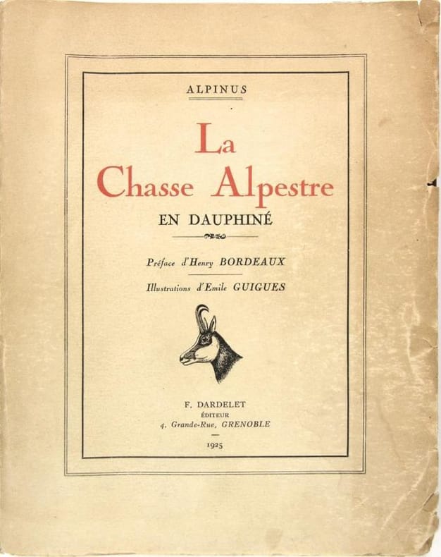 Paris - Grenoble, Arthaud 1949, 195x135mm, 295pages, reliure chagrin. Nom de l’auteur en lettres dorées au dos. Dos et plats ornés d’un paysage alpestre avec un chamoix. Couverture d’origine conservée à l’intérieur. Très bel exemplaire.