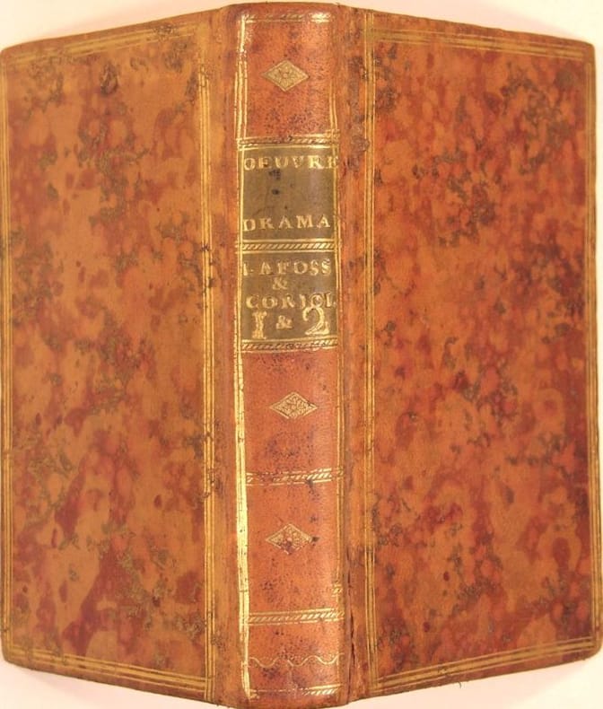 Paris au bureau général des chef-d'oeuvres dramatiques, 1789 & 1791. 2 volumes en un in-16 (13 x 8 cm) reliure plein veau tacheté du temps, dos lisse à pièce de titre verte et petits fers dorés, triple filets sur les plats - De La Fosse : (Manlius Capitolinus) 2 f. n.p., 30 p., 1 f. n.p., xvj p., 72 p., (Polixene) 1 f. n.p., xviij p., 76 pages. - La Harpe : (Coriolan) 3 f. n.p., lxxxviij p., 62 pages.