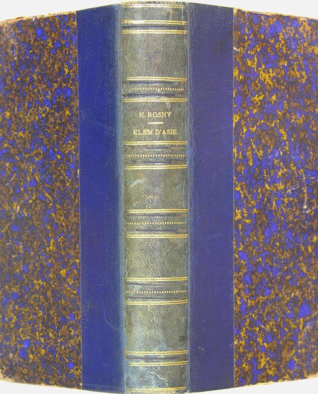 Première édition illustrée. Collection Edouard Guillaume Lotus bleu. La couverture est à la date de 1896, la page de titre à celle de 1897. Un frontispice en double état, noir et sanguine, 6 hors-texte et en-tête, culs-de-lampe... L'ensemble délicatement érotique par Mittis. Impression sur papier velin glacé blanc. Tirage courant après 50 sur japon numérotés et 50 chines numérotés. Couvertures conservées. Reliure en plein chagrin noir d'époque. Dos lisse orné de 2 petits fers en miroir en tête et d'une tulipe stylisée sur le dos. Filet d'encadrement sur les plats. Frise intérieure. Tête dorée. Grandes marges. Quelques rares pâles rousseurs éparses. Très bel exemplaire. Roman préhistorique où l'on retrouve un des personnages les plus connus de l'univers préhistorique de Rosny Aîné, Vamireh. Dans ses pérégrinations, il croise Elem, une jeune fille d'une autre tribu, qu'il capture. Il lui faudra combattre ce clan pour garder sa conquête. On retrouve le style de l'auteur, incroyablement touffu et lyrique, typique de cette fin de siècle. Avec différents groupes d'hominidés, Rosny Aîné est le seul et le premier à donner une version plausible et réaliste de la préhistoire. - Photographies et détails sur www.Edition-Originale.com -
